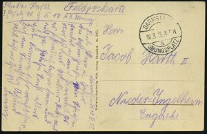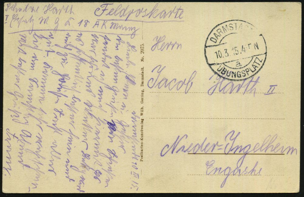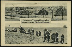 170 | 14 € | TRUPPENÜBUNGSPLÄTZE bis 1918 : DARMSTADT-/ a/ ÜBUNGSPLATZ 1915 (10.3.) 1K-Brücke auf s/w.-Foto-Ak.: Gruss vom Truppenübungsplatz bei Darmstadt, Wellblechhausen (2 Ansichte: Lager, Übung) hs. Abs.: "..I. Ersatz, M(aschinen) G(ewehr) K(ompanie) Mainz", Feldpost-Kt. (Uhv.: Kunstverl. Wilh. Gerling, Darmstadt Nr.2075) | ![]() ![]() | |