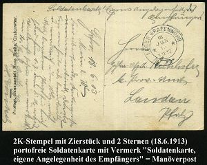 168 | 18 € | TRUPPENÜBUNGSPLÄTZE bis 1918 : DARMSTADT/ UEBUNGSPLATZ 1906 (6.8.) 1K-Gitter + hs. Vermerk "Soldatenbrief, Angelegenheit d. Empf."(ängers) , Color-Litho-Ak.: GRUSS vom ÜBUNGSPLATZ bei DARMSTADT (3 Ansichten) klar gest., portofreie Manöver-Kt. n. Kolberg, vs. AS. | ![]() ![]() | |