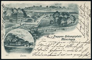 247 | 18 € | TRUPPENÜBUNGSPLÄTZE bis 1918 : MÜNSINGEN 1897 (3.8.) 1K auf Color-Litho-Ak.: GRUSS vom Truppenübungsplatz.. (Teilansicht Lager u. Hotel Fezer etc.) Bedarf n. Schwäb. Hall, vs. AS. (Mi.58 EF Wttbg.) | ![]() ![]() | |