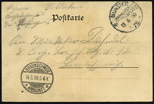 267 | 14 € | TRUPPENÜBUNGSPLÄTZE bis 1918 : MUNSTER/ (HANNOVER)-/ UEBUNGSPLATZ/ ** 1900 (13.6.) 1K + hs. Zusatz "Eigene Angelegenheit des Empfängers Soldatenbrief" , s/w.-Foto-Ak.: Baracken, portofreie Manöver-Kt. n. Braunschweig, vs. AS. (Uhv.20318, Verlag A.H.Günter) | ![]() ![]() | |