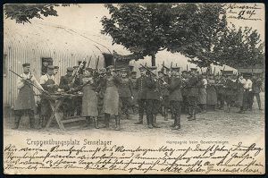 287 | 14 € | TRUPPENÜBUNGSPLÄTZE bis 1918 : SENNELAGER/ *(Kr.PADERBORN)/ a 1905 (17.5.) 1K-Gitter = Hauspostamt Truppenübungsplatz , s/w.-Foto-Ak.: ..Kompagnie beim Gewehrreinigen, Bedarf n. Apolda, vs. AS. (Mi.70) | ![]() ![]() | |