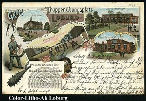 235 | 15 € | TRUPPENÜBUNGSPLÄTZE bis 1918 : Loburg 1898 (17.7.) Color-Litho-Ak.: Gruss vom TRUPPEN-ÜBUNGSPLATZ Loburg = 3 Ansichten mit Kavallerie, Geschütze etc. (Frankatur abgelöst, kl. Riß) seltene Bedarfs-Kt. (n. Magdeburg) | ![]() | |