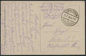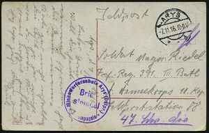 200 | 16 € | TRUPPENÜBUNGSPLÄTZE bis 1918 : HAMMELBURG LAGER 1917 (22.2.) 1K + seltener viol. 1K-HdN: N a h k a m p f mittelschule II. A.-K./ Lager Hammelburg auf monochromer Foto-Ak.: .. Lehrkompanie des Bayer. M.G. Lehrkurs.. + hs. Abs.: "..Landw. Inf. Regt. 4..", klar gest. Feldpost-Kt. n. Ludwigshafen (Uhv. O.Hepperlin.. Hammelbg.) | ![]() ![]() | |