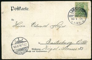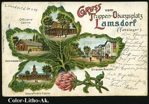 219 | 20 € | TRUPPENÜBUNGSPLÄTZE bis 1918 : LAMSDORF/ UEBUNGSPLATZ 2/ ** 1904 (23.4.) 1K-Segment mit UZ "2"= Hauspostamt Truppenübungsplatz , klar gest. Color-Litho-Ak.: GRUSS vom Truppen-Übungsplatz Lamsdorf (Fusslager) mit 4 Ansichten (Uhv.Paul Neumann, Neisse), Bedarf (n. Insterburg) | ![]() ![]() | |