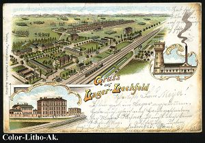 222 | 18 € | TRUPPENÜBUNGSPLÄTZE bis 1918 : LAGER-LECHFELD 1898 (13.6.) 1K mit Bindestrich = Hauspostamt Truppenübungsplatz auf Color-Litho-Ak.: Gruss aus Lager Lechfeld (6 Ansichten, dabei Kloster u. Wasserwerk etc.) Bearf n. Dudweiler (Uhv.: Ringler & Sohn, Augsburg) | ![]() ![]() | |