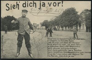 299 | 14 € | TRUPPENÜBUNGSPLÄTZE bis 1918 : WAHN (RHEINL:)-/ SCHIESSPLATZ 1909 (2.8.) 1K-Gitterbrücke = Hauspostamt Truppenübungsplatz + hs. Vermerk "Soldatenbrief, Eigenen Angelegenheit des Empfängers" , klar gest. s/w.-Humor-Ak.: Sieh´ dich ja vor!.. Sommefrische in Wahn.. (Soldat mit leeren Taschen) portofreie Manöver-Kt. an 3. C. Jnf. Regt. No. 81 in Frankfurt a.M. (Uhv.: Verlag Hch. Herzogenrath, Wahn No.75) | ![]() ![]() | |