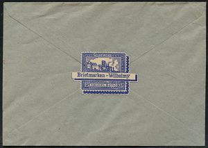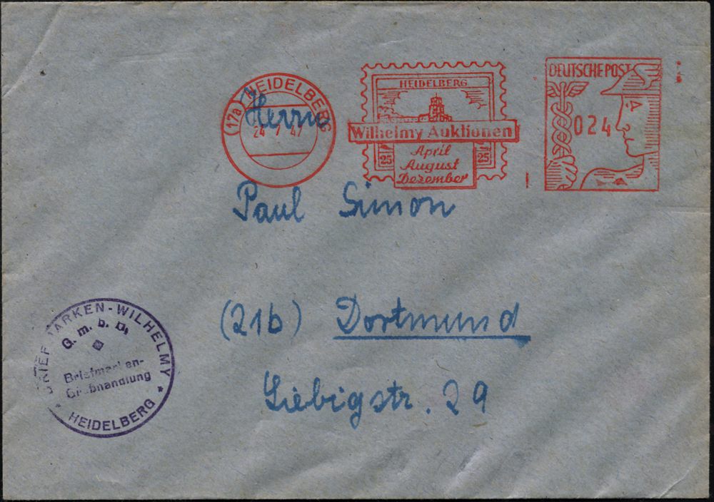 3535 | 25 € | WESTZONEN / BIZONE / TRIZONE (BIS 1949) : (17a) HEIDELBERG/ Wilhelmy Auktionen.. 1947 (24.7.) seltener AFS Postalia, Sonerform "Merkur" = Briefmarken-Imitation mit Heidelbg. Schloß, rs. motivgleiche Verschluß-Vignette! + viol. Abs.-1K-HdN, Firmen-Fern-Bf. (Dü.E-19 B-160, nur wenige Maschinen!) | ![]() ![]() | |