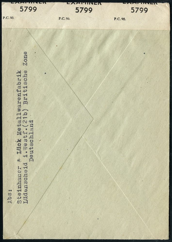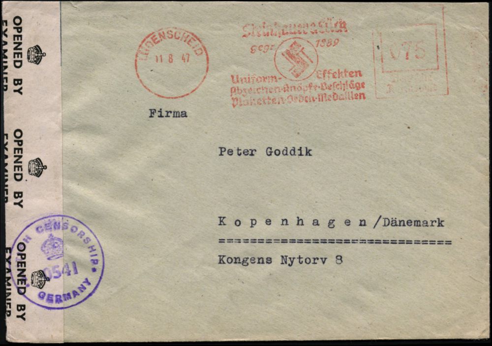 3542 | 20 € | WESTZONEN / BIZONE / TRIZONE (BIS 1949) : LÜDENSCHEID/ Steinhauser & Lück/ gegr.1889/ Unifor,-Effekten/ Abzeichen../ Medaillen 1947 (11.8.) ap-tierter AFS Francotyp "Reichsadler" 075 Pf. = entfernt = Notmaßnahme + brit. Zensur-1K: BRITISH CENSORSCHIP/0541/GERMANY + Zensurstreifen: OPENED BY/EXAMINER/5799 (= Bonn, Rie.B-6, B-101) seltener Ausl.-Zensur-Bf. n. Kopenhagen (Dü.E-13F-107o) | ![]() ![]() | |