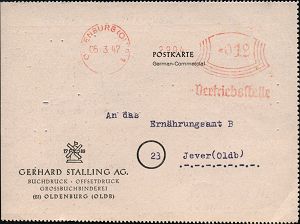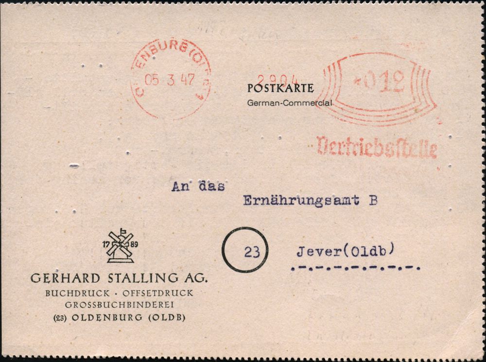 3549 | 25 € | WESTZONEN / BIZONE / TRIZONE (BIS 1949) : OLDENBURG 1/ Vertriebsstelle 1947 (5.3.) sehr seltener, aptierter AFS "Bogenrechteck" = DEUTSCHES REICH entfernt auf Firmen-Kt.: GERHARD STALLING AG, BUCHDRUCK - OFFSETDRUCK.., Text über Druck von Lebensmittelkarten! (Dü.E-10E-42m = seltene Type!) | ![]() | |
