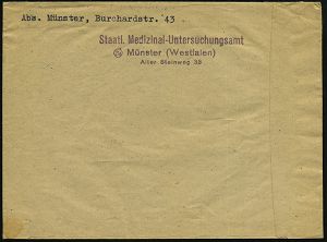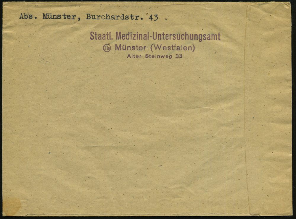 3548 | 15 € | WESTZONEN / BIZONE / TRIZONE (BIS 1949) : (21) MÜNSTER (WESTF) 2/ b/ Gedenke der Opfer/ des/ Nazi-Regimes 1947 (20.9.) seltener MWSt , rs. Abs.-3L: Staatl. Medizinal-Untersuchungsamt.., klar gest. Dienst-Bf. nach FFm. (Bo.S 153 A, nur 1 Monat verwendet!) | ![]() ![]() | |