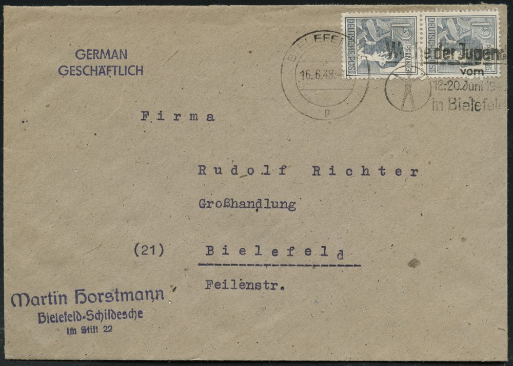 3512 | 18 € | WESTZONEN / BIZONE / TRIZONE (BIS 1949) : BIELEFELD 2/ p/ Woche der Jugend/ vom/ 12.-20.Juni.. 1948 (26.5.) seltener MWSt (Mensch im Kreis) Bedarfs-Bf. (Bo.8 B , nur wenige Tage verwendet !) | ![]() | |