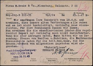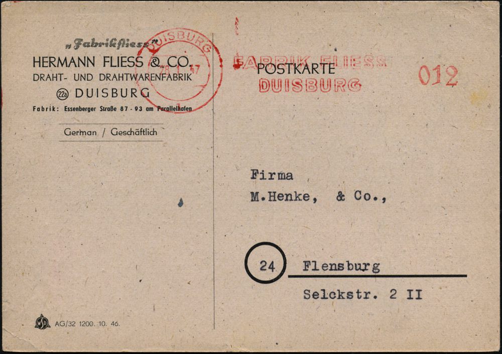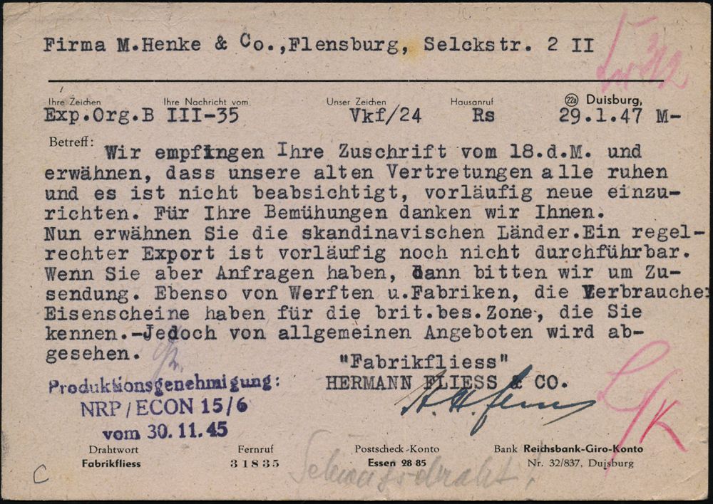 3521 | 23 € | WESTZONEN / BIZONE / TRIZONE (BIS 1949) : DUISBURG/ 1/ FABRIK FLIESS 1947 (28.1.) total aptierter AFS Francotyp = Wertrahmen kompl. entfernt + rs. alliierter Permit-3L: Produktionsgenehmigung/NRP ECON 15/6.., Firmen-Kt. mit Text: "..ein regelrechter Export ist vorläufig noch nicht durchführbar" n. Flensburg (Dü.E-E-16CEo) | ![]() ![]() | |