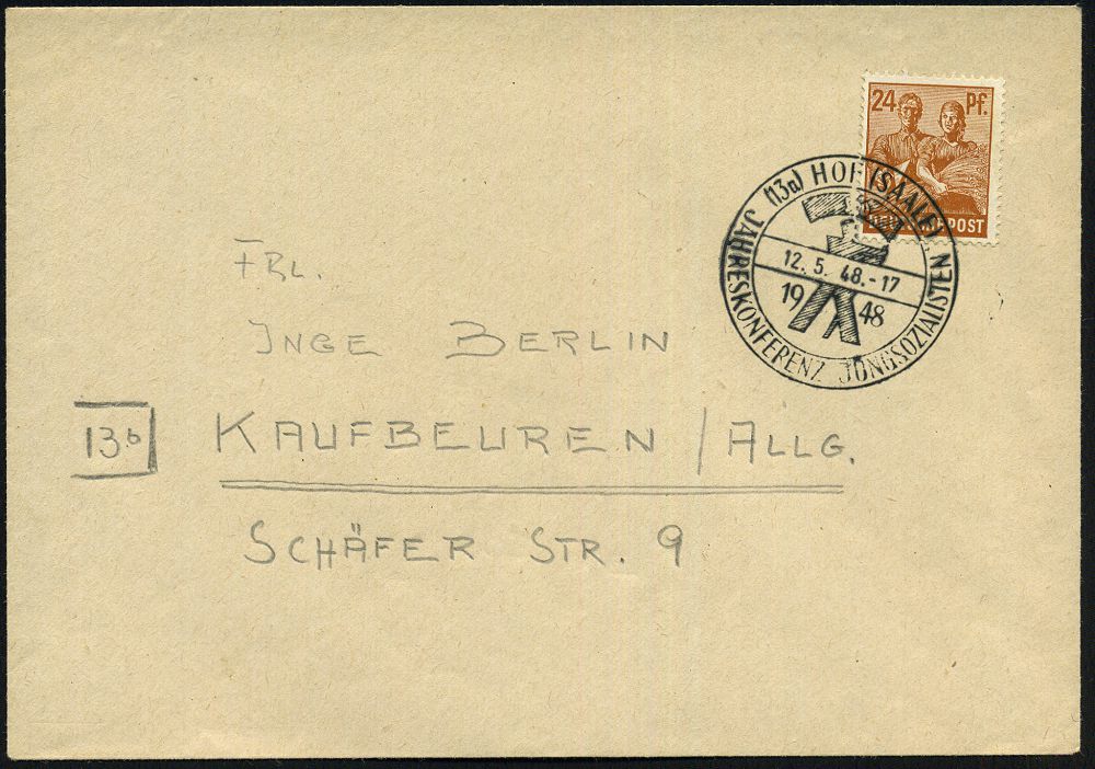 3538 | 15 € | WESTZONEN / BIZONE / TRIZONE (BIS 1949) : (13a) HOF(SAALE)/ JAHRESKONFERENZ JUNGSOZIALISTEN 1948 (12.5.) SSt = Figur mit S.P.D.-Flagge , klar gest. Bedarfs-Bf. (Bo.4) | ![]() | |