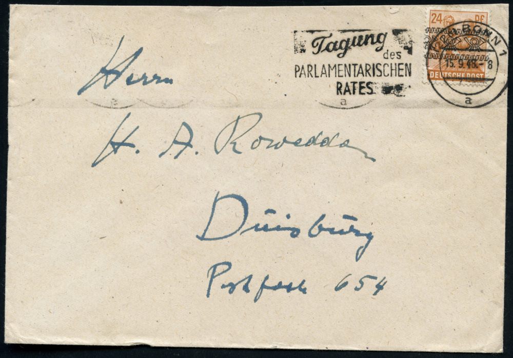 3517 | 25 € | WESTZONEN / BIZONE / TRIZONE (BIS 1949) : (22c) BONN 1/ a/ Tagung/ des/ PARLAMENTARISCHEN/ RATES 1948 (20.10.) seltener u. gesuchter MaWSt auf Posthörnchen-Bandaufdruck 24 Pf. (Mi.44 I) Bedarfs-Bf., saubere u. vollständige Abdrucke sind selten! (Bo.6 A) | ![]() | |