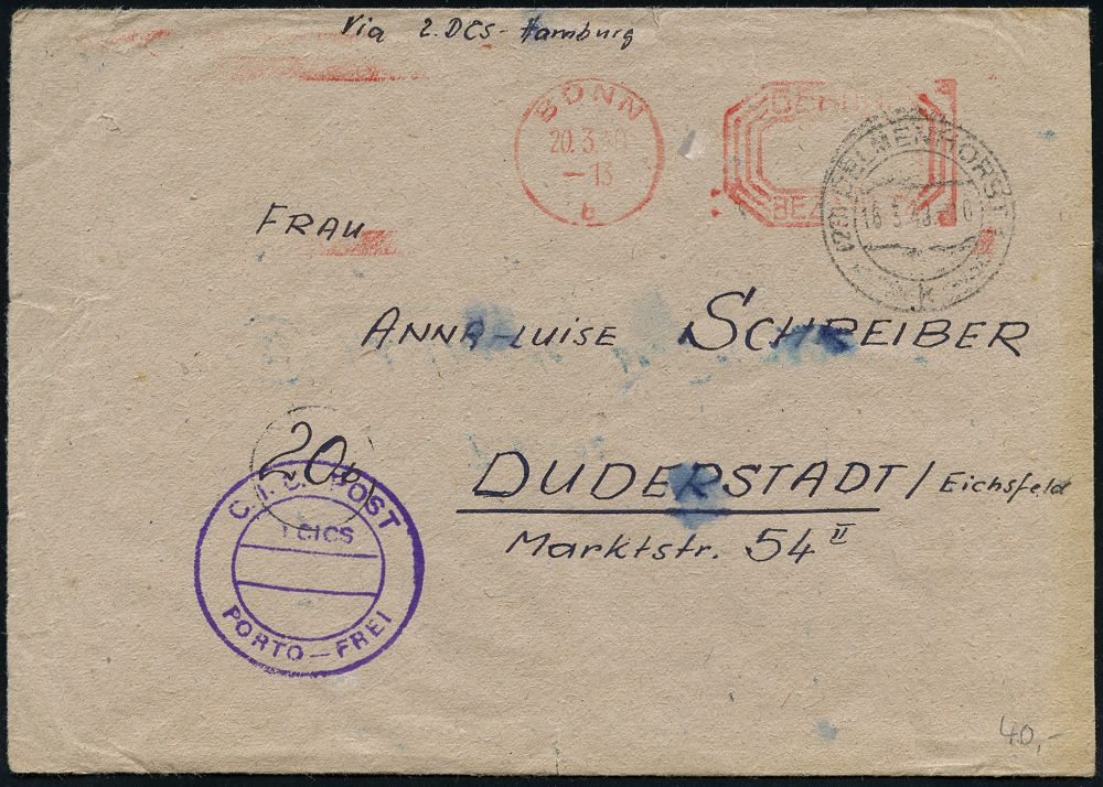 3513 | 25 € | WESTZONEN / BIZONE / TRIZONE (BIS 1949) : BONN/ b/ GEBÜHR/ BEZAHLT 1947 (13.3.) Post-FS "Achteck" ohne Wertziffer, Sonderform + viol. Zensur-1K: MILITARY CENSORSHIP /19252 (= brit. Zensur, Bonn, Rie.B-5) Faltbf. eines Zivil-Internierten (NS-Belasteten), hs. Civil Jnternment Camp Nr.5 (= B.A.O.R.) mit Inhalt n. Kirchhorsten (Dü.245) | ![]() ![]() | |