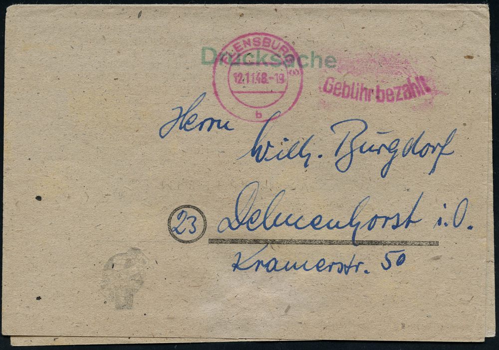 3524 | 18 € | WESTZONEN / BIZONE / TRIZONE (BIS 1949) : FLENSBURG 3/ b/ Gebühr bezahlt 1948 (12.11.) seltener, aptierter PFS, "Reichspost" entfernt! , Falt-Bf. mit Inhalt (Verein PHILA-VE e.V.) n. Delmenhorst (Dü.D-9, Nr.244, nur in Flensburg!) | ![]() | |