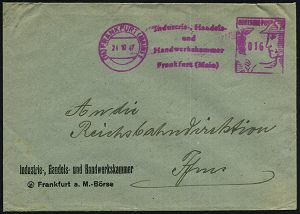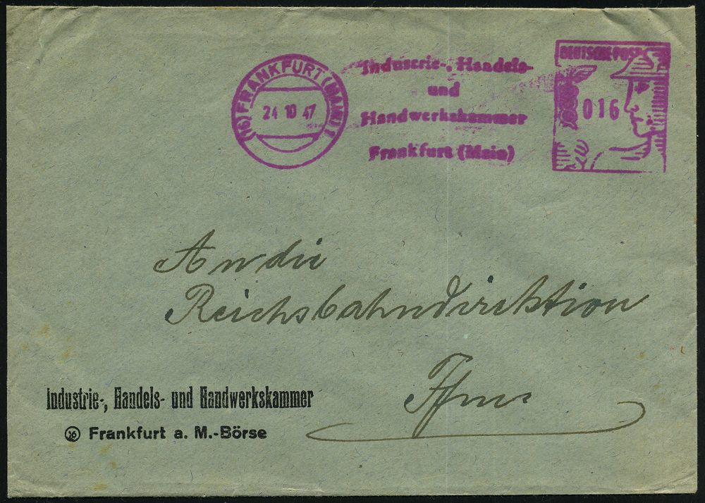 3526 | 30 € | WESTZONEN / BIZONE / TRIZONE (BIS 1949) : (16) FRANKFURT (MAIN) 1/ Industrie-u.Handels-/ und/ Handwerkskammer.. 1947 (24.10.) seltener l i l a AFS Postalia "Merkurkopf" auf entspr. Dienst-Bf. (Dü.E-19B-314, seltene Farbe !) | ![]() ![]() | |