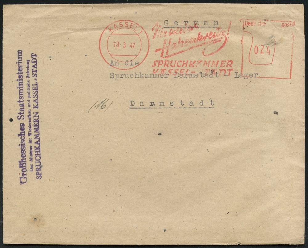 3539 | 40 € | WESTZONEN / BIZONE / TRIZONE (BIS 1949) : KASSEL 1/ Nie wieder/ Hakenkreuz!/ SPRUCHKAMMER/ KASSEL-STADT 1947 (18.3.) ungewöhnlicher, aptierter AFS Postalia "NS-Adler" (= enfernt) "Deutsche post" = Notmaßnahme + viol. Abs.-3L: Großhess. Staatsministerium/Der Minister für Wiederaufbau u. polit. Befreiung/SPRUCHKAMMER.. = Entnazifierungs-Behörde, klar gest. seltener Dienst-Bf. an Spruchkammer Darmstadt (Dü.E-15 E) | ![]() | |