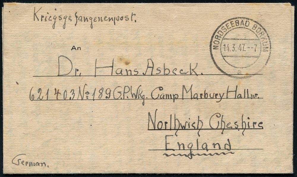 3518 | 12 € | WESTZONEN / BIZONE / TRIZONE (BIS 1949) : BORKUM NORDSEEBAD/ a 1946 (28.8.) 2K-Steg auf portofreiem Kgf.-Faltbf. mit Inhalt an britisches Kgf.-Lager "Camp Dunham Park" (Altricham, Cheshire) mit Text: ".. Warten auf die Entlassung.." | ![]() | |