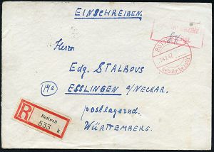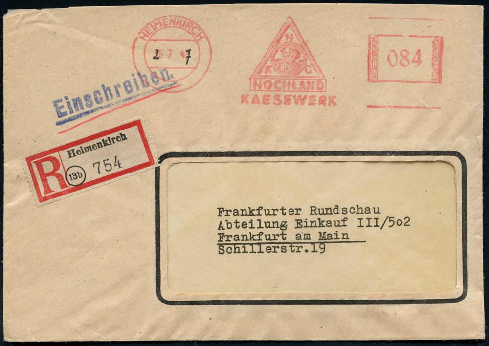 3537 | 28 € | WESTZONEN / BIZONE / TRIZONE (BIS 1949) : HELMENKIRCH/ HOCHLAND/ KAESSWERK 1947 (25.7.) aptierter AFS Francotyp "Hakenkreuz" = entfernt + Inschrift "Deutsches reich") = Notmaßnahme, hs. korrigiertes Datum (Firmenlogo) RZ mit PLGZ: (13 b) Helmenkirch, klar gest. Fern-R-Bf. (Dü.E-12 AF-CEo, Nr.98 o = seltene Type !) | ![]() | |