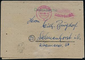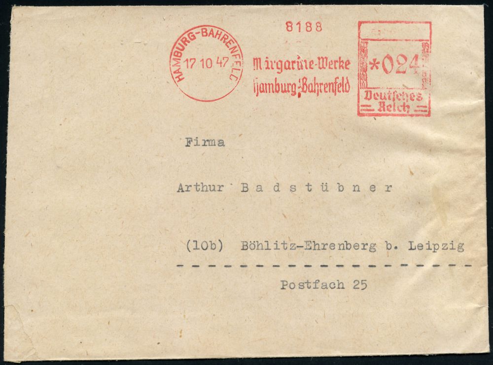 3532 | 22 € | WESTZONEN / BIZONE / TRIZONE (BIS 1949) : HAMBURG-BAHRENFELD/ Margarine-Werke.. 1947 (17.10.) seltener, aptierter AFS Francotyp "Hakenkreuz" = entfernt = Notmaßnahme! , rs. Abs.-Vordruck (kl. Randriß) in die SBZ (Dü.E-12K-85h) | ![]() | |