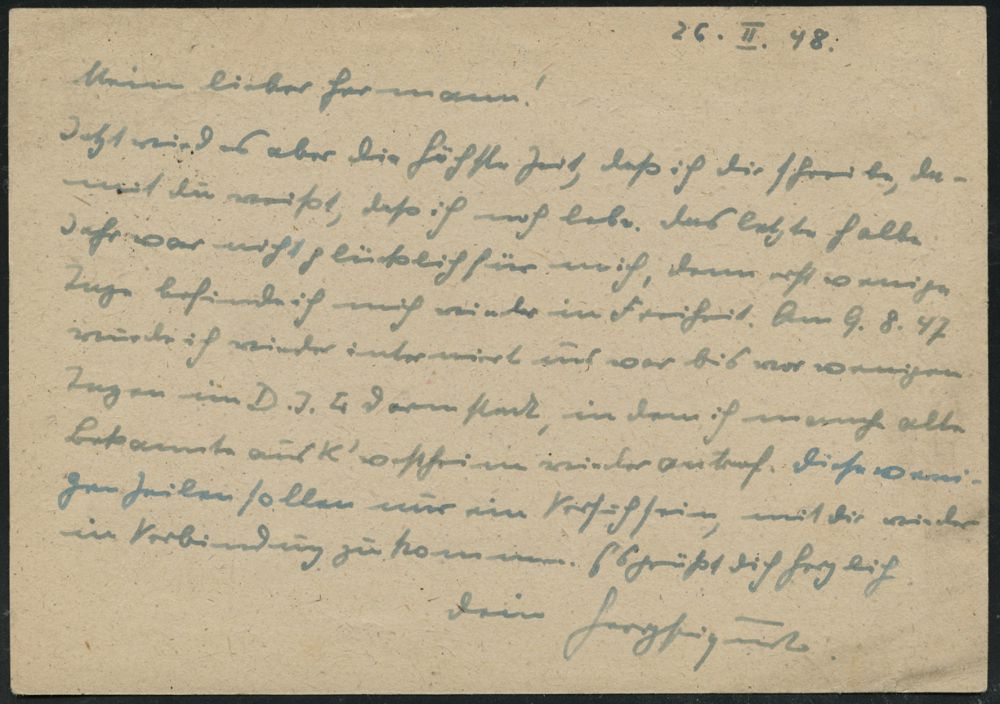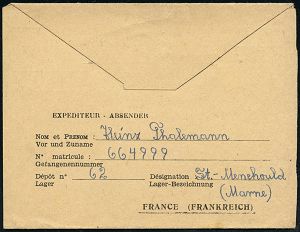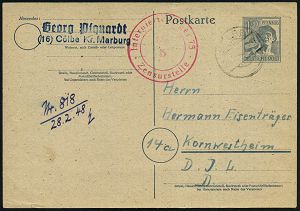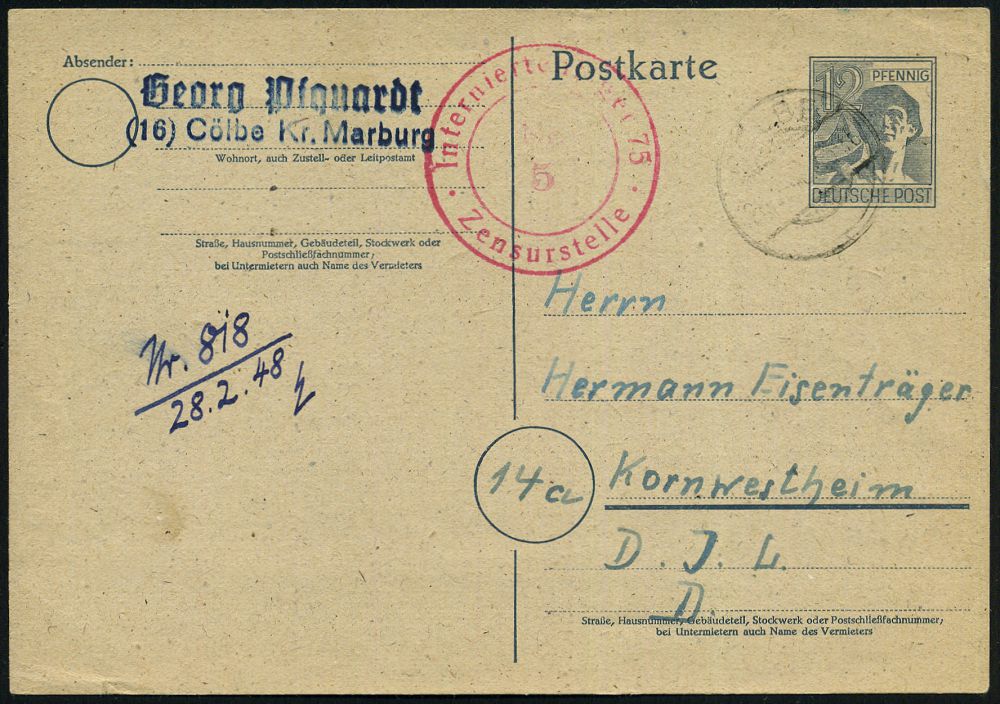 3541 | 20 € | WESTZONEN / BIZONE / TRIZONE (BIS 1949) : Kornwestheim 1948 (26.2.) roter Zensur-2K: Interniertenlager 75/5/Zensurstelle = Internierungslager für NS-Belastete in Kornwestheim (Wo.1, Nr.5 Wo. unbekannt) + hs. Registrier-Nr. + 1K-Brücke: CÖLBE auf Inl.-P 12 Pf. Arbeiter | ![]() ![]() | |