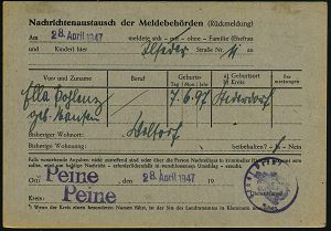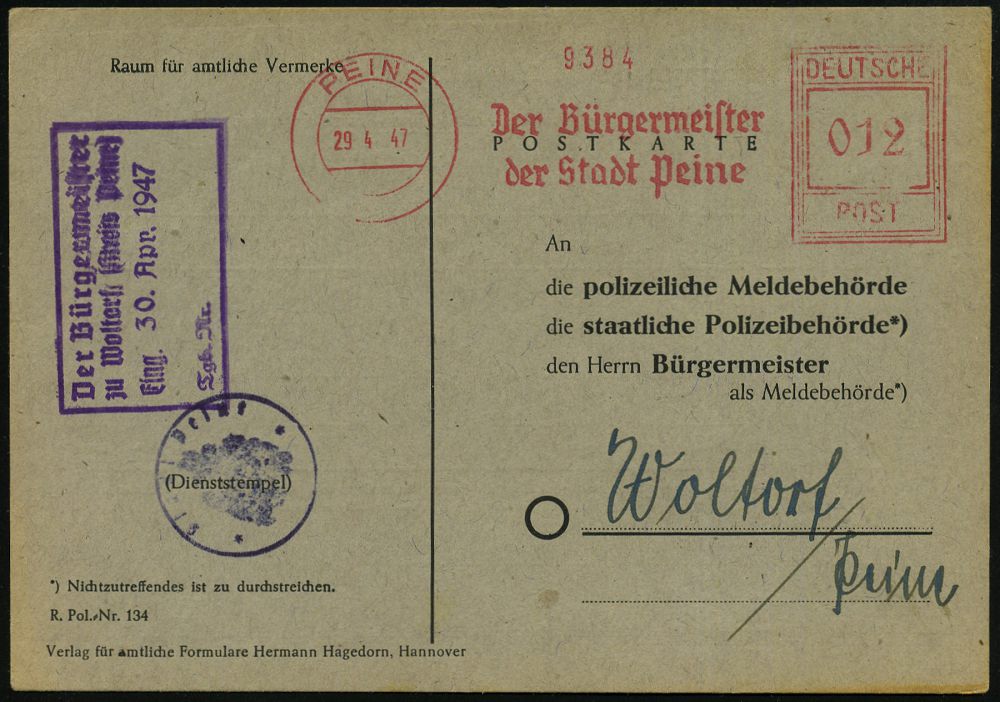 3550 | 16 € | WESTZONEN / BIZONE / TRIZONE (BIS 1949) : PEINE/ Der Bürgermeister.. 1947 (29.4.) seltener AFS Francotyp "Hochrechteck" auf Dienst-Fern-Kt.: polizeil. Nachrichtenaustausch Meldebehörde n. Woltorf (Dü.E-18CEh, nur 1 1/2 Jahre verwendet) | ![]() ![]() | |
