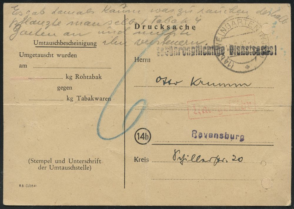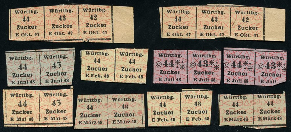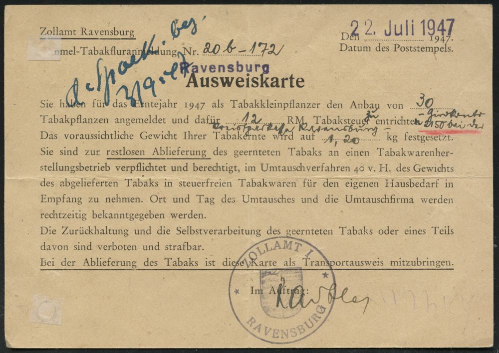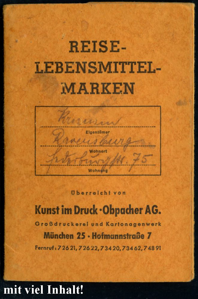 3555 | 30 € | WESTZONEN / BIZONE / TRIZONE (BIS 1949) : (14b) WEINGARTEN (WÜRTT)/ * 1947 (23.7.) 2K-Steg auf Dienstkarte: Zollamt Ravensburg, Ausweiskarte für Tabak-Bezug (Reg.-Lochung geschl.) Kartonheft "REISE-LEBENSMITTEL-MARKEN" ür Brot, Zucker, Butter, Fett u. Käse etc. m i t Inhalten, d. h. zahllose Lebensmittelmarken. Zeit-Belege der Mangelwirtschaft! | ![]() ![]() ![]() ![]() ![]() ![]() | |