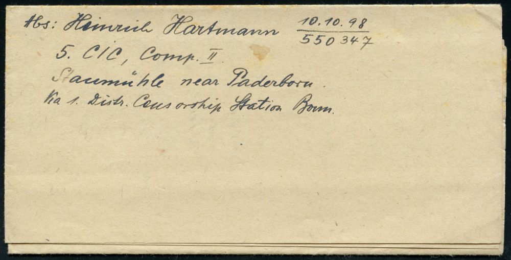 3514 | 30 € | WESTZONEN / BIZONE / TRIZONE (BIS 1949) : BONN/ b/ GEBÜHR/ BEZAHLT 1947 (1.8.) Post-FS "Achteck" ohne Wertziffer auf Falt-Bf. mit Inhalt , rs. hs. Abs.: "5. CIC, Comp.II, Staumühle.. Distr. Censorship Station Bonn" = Zivili-Internierter mit NS-Belasteten, Text: ".. eine Vernehmung hatte ich nocht nicht..", seltener Beleg n. Kirchhorsten! (Dü.D9, Nr.246) | ![]() ![]() | |