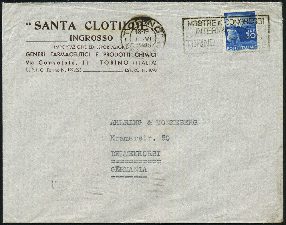 3516 | 18 € | WESTZONEN / BIZONE / TRIZONE (BIS 1949) : Bonn 1948 (1.6.) Italien 30 L. Fackel, EF + rs. britischer Zensur-Ma.WellenSt.: (10) im Kreis + 6 Wellen rechts (= Bonn, Rie. + 100 Pkte.) Ausl.-Zensur-Firmen-Bf. (Torino) n. Delmenhorst (Mi.702 EF) | ![]() ![]() | |