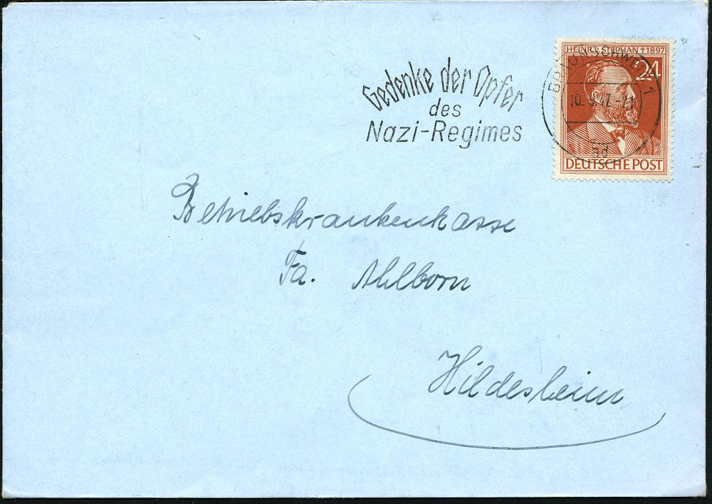 3519 | 18 € | WESTZONEN / BIZONE / TRIZONE (BIS 1949) : BRAUNSCHWEIG 1/ ad/ Gedenke d.Opfer/ des/ Nazi-Regimes 1947 (10.9.) seltener Serien-MWSt klar auf Firmen-Bf., rs. Abs.-Vordruck: Löwen-Apotheke.. (Bo.S 453 A, nur 28 Tage verwendet!) | ![]() | |