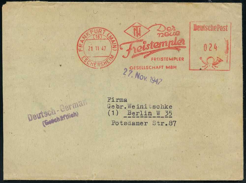 3527 | 18 € | WESTZONEN / BIZONE / TRIZONE (BIS 1949) : (16) FRANKFURT (MAIN)/ ESCHERSHEIM/ TN/ Der/ neue/ Freistempler/ FREISTEMPLER/ GMBH 1947 (21.11.) AFS Postalia "Posthorn" (Firmen-Monogr.-Logo) klar gest. Fern-Bf. n. West-Berlin (Dü.E-20 B) | ![]() ![]() | |