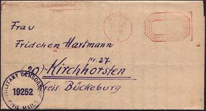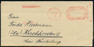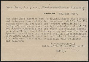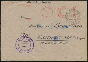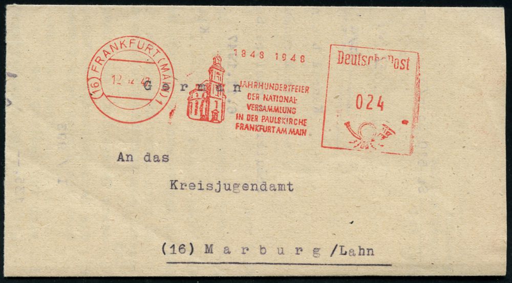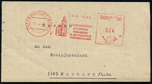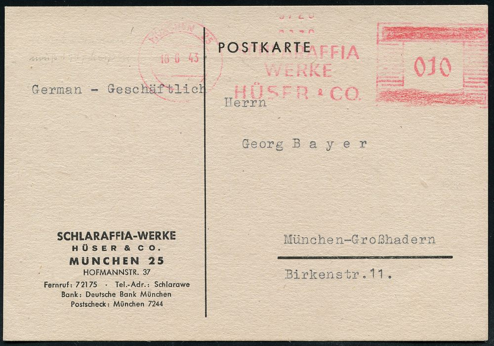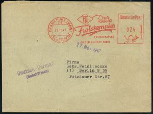 3543 | 30 € | WESTZONEN / BIZONE / TRIZONE (BIS 1949) : MÜNCHEN 25/ SCHLARAFFIA/ WERKE/ HÜSER & CO. 1947 (18.6.) seltener, individduell aptierter AFS Francotyp Mäanderrechteck "DEUTSCHES REICH" handschriftl. rot übermalt = Notmaßnahme! (Datums-Irrtum "1943") Firmen-Orts-Kt. mit interess. Text !, Unikat! (ähnlich Dürst E-11 A) | ![]() ![]() | |