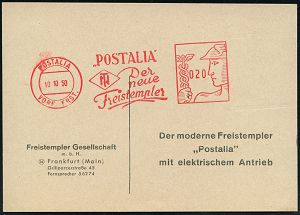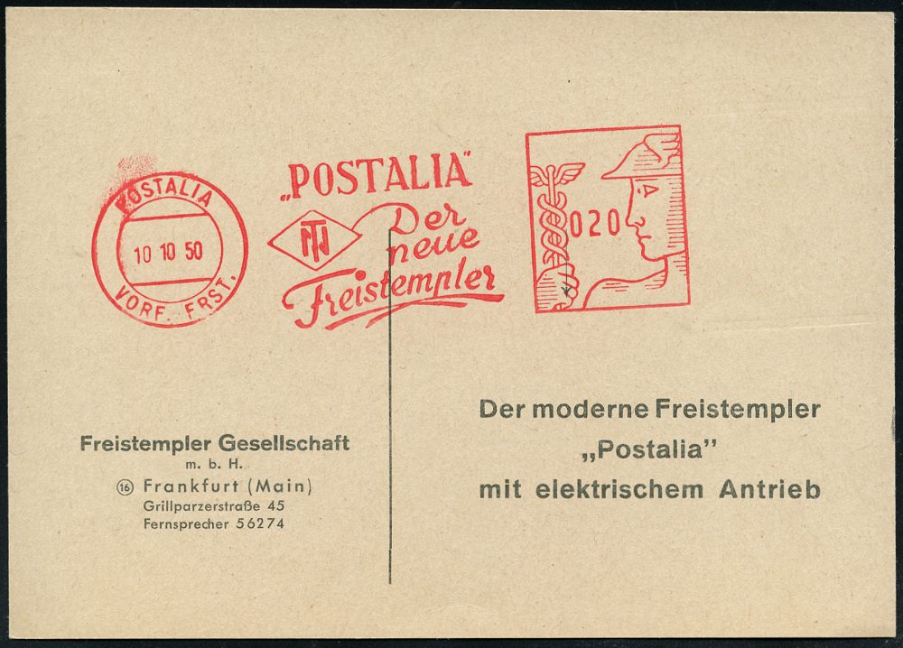 3530 | 30 € | WESTZONEN / BIZONE / TRIZONE (BIS 1949) : Frankfurt/ Main 1950 (10.10.) AFS Postalia "Merkurkopf": POSTALIA/VORF.-FRST./POSTALIA/TN/Der/neue/Freistempler 020 Pf. , klar gest.Muster-Karte: Freistempler-GmbH = Fa. Telefonbau 6 Normalzeit, seltener Beleg! (Dü.E-19B, Muster) | ![]() | |