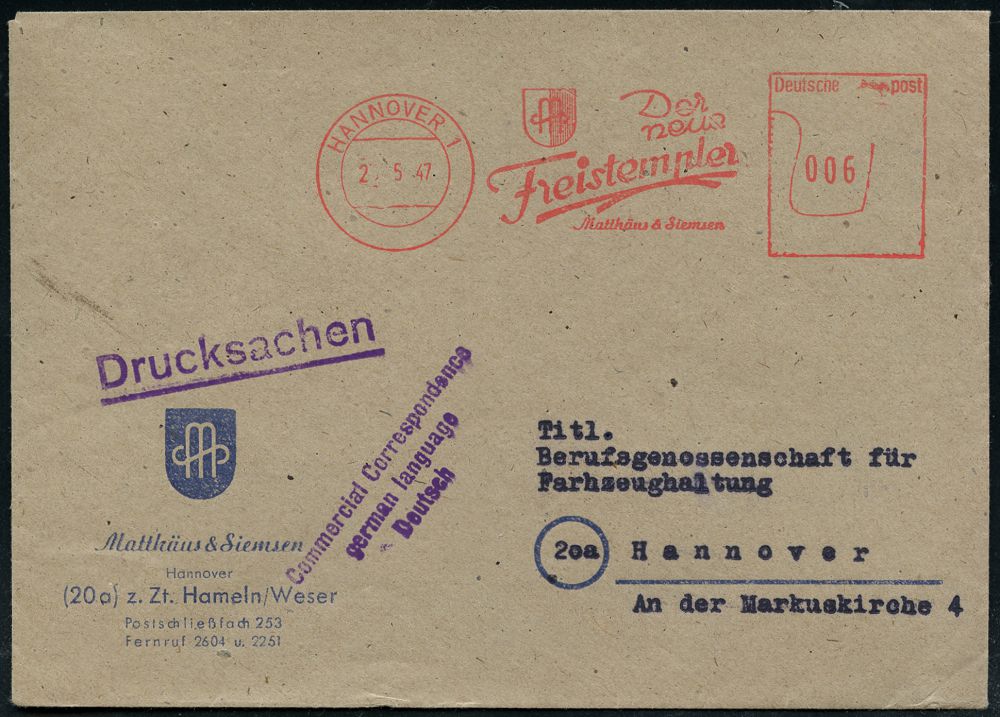 3533 | 28 € | WESTZONEN / BIZONE / TRIZONE (BIS 1949) : HANNOVER 1/ Der/ neue/ Freistempler/ Matthäus & Siemsen 1947 (25.5.) seltener, aptierter AFS Postalia "Reichsadler", nur Konturen + "Reichs" entfernt = Notmaßnahme! (Monogr.-Logo) motivgl. Firmen-Orts-Bf. (Dü.E-15 F) | ![]() | |