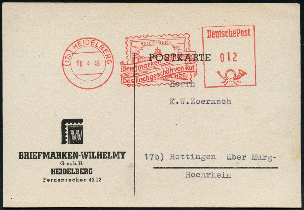 3536 | 20 € | WESTZONEN / BIZONE / TRIZONE (BIS 1949) : (17a) HEIDELBERG/ Briefmarken Wilhelmy.. 1948 (10.4.) AFS Postalia "Posthorn" 012 Pf. (Briefmarken-Imitation mit Heidelbg. Schloß) klar gest. Firmen-Kt. (Dü.E-20 B) | ![]() | |