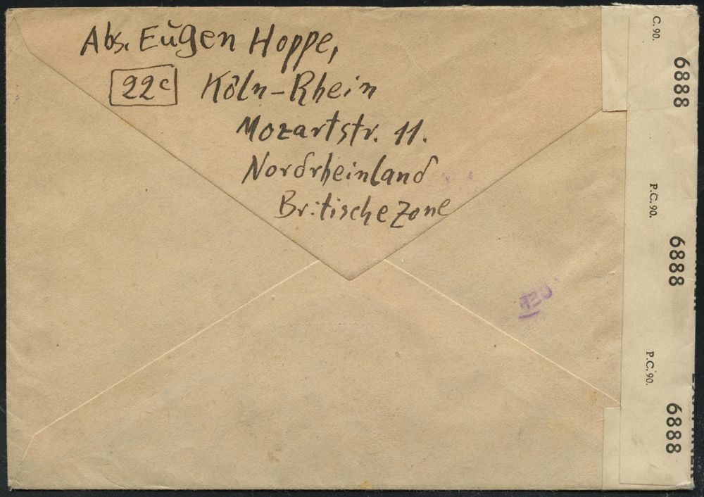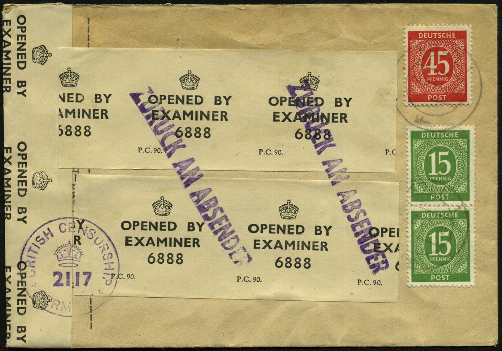 3540 | 25 € | WESTZONEN / BIZONE / TRIZONE (BIS 1949) : Köln 1 1947 (3.6.) 2x 15 Pf. u. 45 Pf. Kontrollrat Ziffer = Ausl.-Tarif + viol. 1L: ZURÜCK AN ABSENDER auf brit. Zensur-Zettel: OPENED BY/ EXAMINER/ 6888 (P.C. 90.) + viol. 1K: BRITISH CENSORSHIP/2117 (= Bonn), Destinations-Adresse voll überklebt !, Zensur-Retour-Bf. (Mi.2x 922, 932) | ![]() ![]() | |