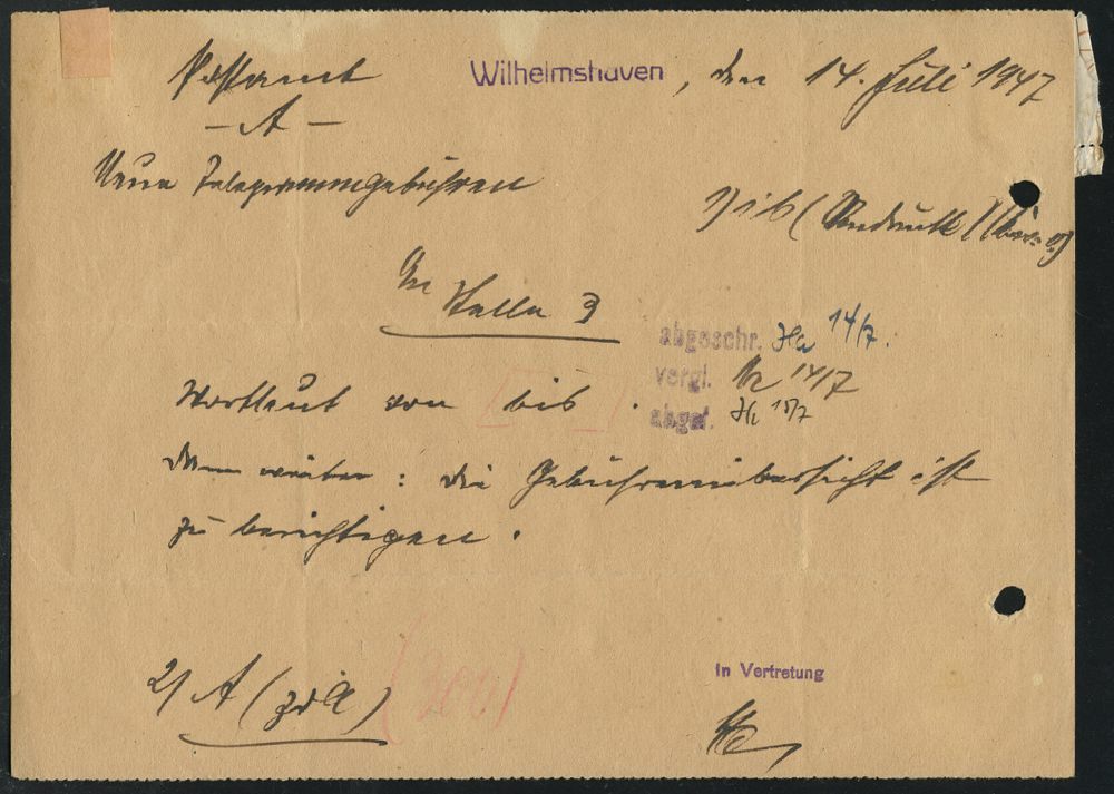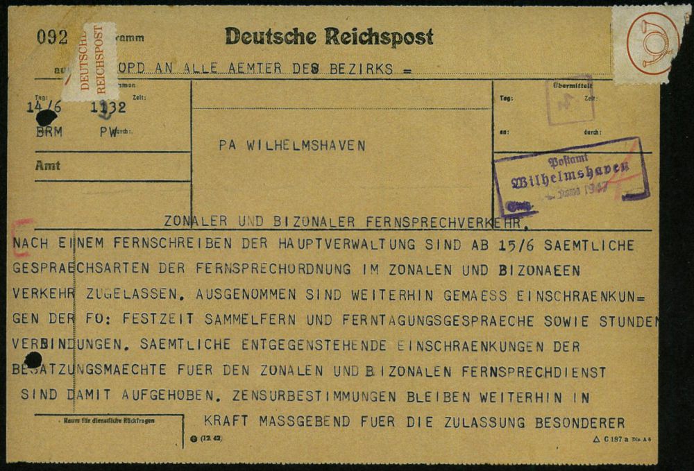 3558 | 40 € | WESTZONEN / BIZONE / TRIZONE (BIS 1949) : Wilhelmshaven / Bremen 1947 (3.6.) viol. Ra.4: Postamt/Wilhelmshaven.. auf Dienst-Telegramm "Deutsche Reichspost" (gelocht, kl. Rostfleck) + Telegr.-Verschlußmarke (Posthorn) interess. Text über alliierte Zulassung des interzonalen Telegramm-Verkehrs! aus Bremen, sehr seltenes Zeitdokument!, in dieser Form Unikat! (Form: 12.43 / X C 187 Din A 5. (Kl. 29)) | ![]() ![]() | |