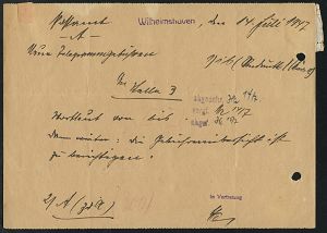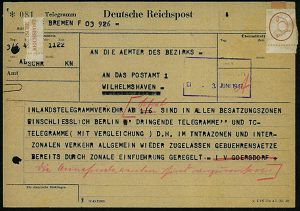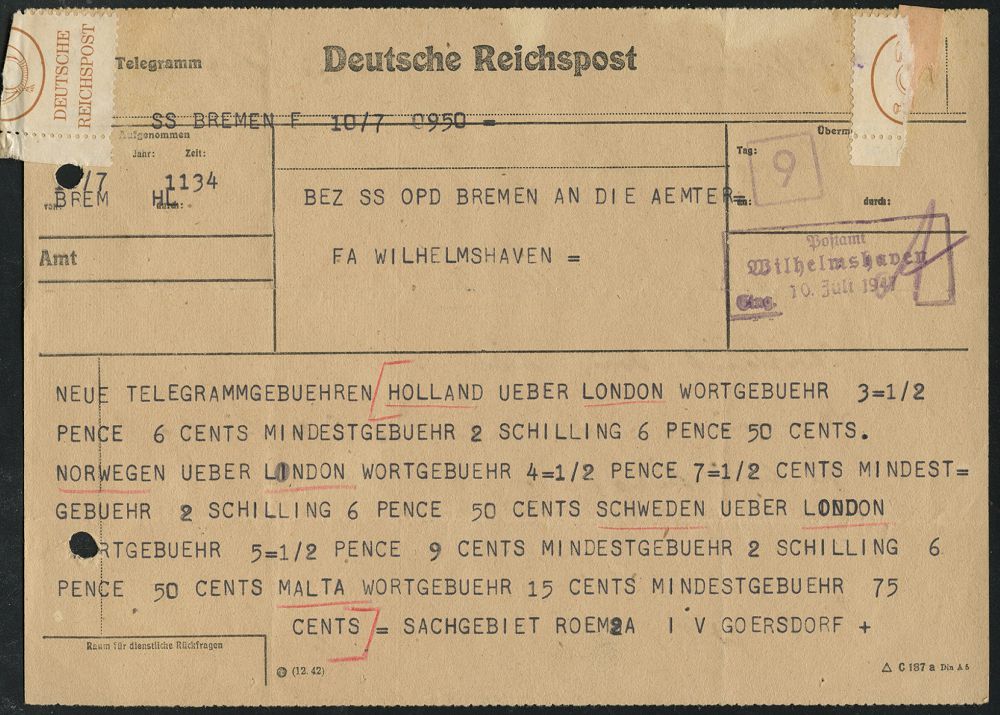 3560 | 40 € | WESTZONEN / BIZONE / TRIZONE (BIS 1949) : Wilhelmshaven / Bremen 1947 (10.7.) viol. Eingangs-Ra.3 auf OPD-Dienst-Telegramm "Deutsche Reichspost" (links gelocht) + Telegr.-Verschlußmarke "DEUTSCHE REICHSPOST" (Posthorn) interess. Text über alliierte Bestimmungen im ausländischen Telegramm-Verkehr nach Holland u. London mit Gebühren! aus Bremen, sehr seltenes Zeit-Dokument, in dieser Form Unikat! (Form: (12.42) C 187 a Din A 5) | ![]() ![]() | |