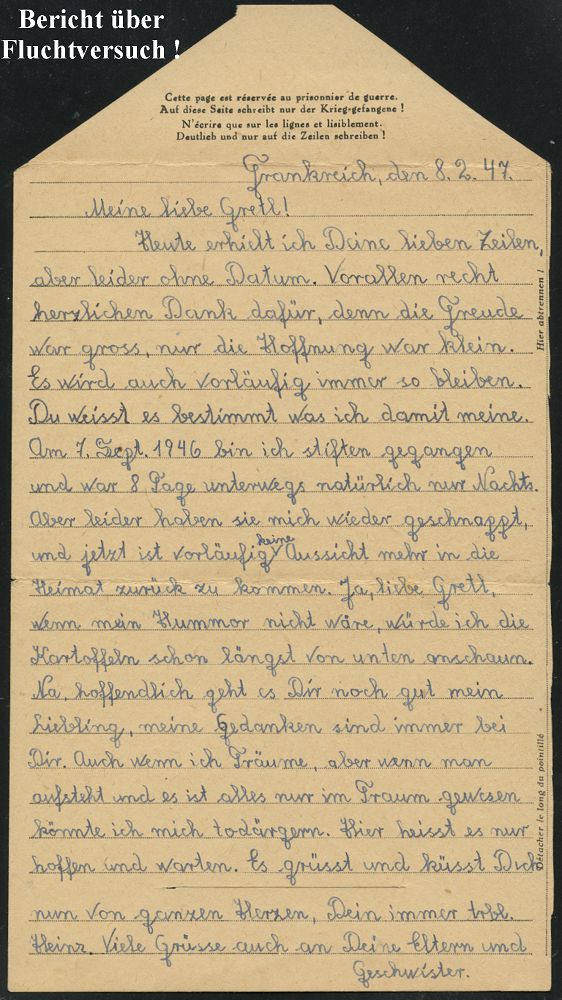3561 | 18 € | WESTZONEN / BIZONE / TRIZONE (BIS 1949) : FRANKREICH / ÖSTERREICH 1947 (8.2) Kgf.-Vordruck-Faltbf. , viol. Zensur-Oval: DEPOT 62/3/CENSURE = Lager St. Menehould, Marne + viol. Ra.2: Rückantwortbriefe nicht zukleben / Zivilbriefe werden nicht ausgehändigt, Falt-Kgf.-Bf. mit Inhalt: interess. Text über gescheiterten Fluchtversuch! n. Wien, Österreich war viergeteilt - wie Deutschland ! | ![]() ![]() ![]() | |