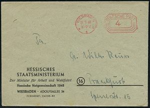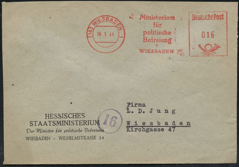 3556 | 18 € | WESTZONEN / BIZONE / TRIZONE (BIS 1949) : (16) WIESBADEN 1/ Ministerium/ für/ politische/ Befreiung.. 1948 (16.1.) AFS Postalia , klar gest. Orts-Dienst-Bf.: HESS. STAATSMINISTERIUM, Der Minister für politische Befreiung.. (Dü.E-20 B) | ![]() | |
