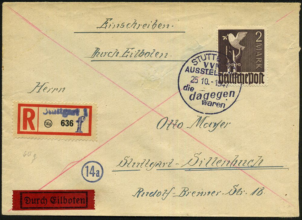 3554 | 40 € | WESTZONEN / BIZONE / TRIZONE (BIS 1949) : STUTTGART/ VVN/ AUSSTELLUNG/ die/ dagegen/ waren 1947 (25.10.) blau-schw. SSt auf seltener EF 3 Mk. "Friedens-taube" (Mi.961 + 350.- EUR) + provis. RZ: Stuttgart 1/f, etwas überfrankierter, seltener Orts-Doppel-Eil-R-Bf., rs. AS. (Bo.105) | ![]() | |