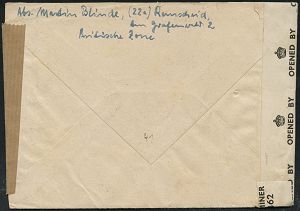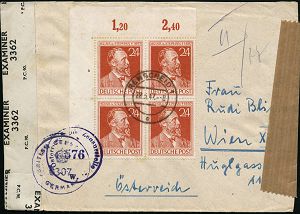 3551 | 22 € | WESTZONEN / BIZONE / TRIZONE (BIS 1949) : REMSCHEID 1/ c 1947 (28.3.) 2K-Steg zentr. auf 24 Pf. H.v. Stephan: Bogen-Eckrand-4er-Block + brit. Zensurstreifen: OPENED BY/ EXAMINER/3362/P.C. 90. + viol. 1K: BRITISH CENSORSHIP/0307/GERMANY = Bonn (Rie.B-6, B-101) + sowjet. Eingangs-Zensur-1K: Österreichische Zensurstelle/576/W. = Wien + neutraler Streifen (Bf. kl. Öffnungsmäng. rs.), Ausl.-Doppel-Zensur-Bf. n. Wien (Mi.963 MeF + 25.- EUR) | ![]() ![]() | |