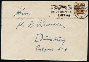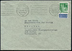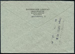 3547 | 25 € | WESTZONEN / BIZONE / TRIZONE (BIS 1949) : (13b) MÜNCHEN BPA 1/ ac 1949 (15.2.) Band-Ma.St auf Abgeordenetn-Bf.: BAYER. LANDTAG, ABGEORDNETER HANS KEESS.. = Schriftführer u. Abgeordneter der nationalistisch, populistischen Partei WAV (Wirtschaftl. Aufbau Vereinigung, 1945-1953) seltener Orts-Bf. an Bayer. Staasministerium der Justiz (Mi.80, 2 Pf. NoB, Mi.2 AW) | ![]() ![]() | |