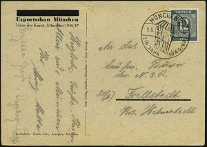 3545 | 18 € | WESTZONEN / BIZONE / TRIZONE (BIS 1949) : MÜNCHEN 2/ EXPORT/ SCHAU/ EIN JAHR 1947 (9.8.) SSt auf geschwärzter Sonderkarte: Exportschau München, Haus der Kunst.. 1946-47 , Raum "TOYS" Spielzeug (kl. Randriß, Michaelis Nr.2 + 40.- DM, 1991) seltene Bedarfskarte (Bo.195) | ![]() ![]() | |