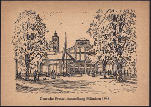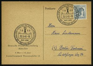 3546 | 16 € | WESTZONEN / BIZONE / TRIZONE (BIS 1949) : (13b) MÜNCHEN 2/ DEUTSCHE PRESSEAUSSTELLUNG 1948 (22.5.) seltener SSt, Type I (Figur mit Zeitung) Ausstellungs-Sonder-Kt.! (Michaelis Nr.7 b + 20.- DM, 1991) n. West-Berlin (Bo.200 , Ty.I) | ![]() ![]() | |