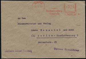 3523 | 25 € | WESTZONEN / BIZONE / TRIZONE (BIS 1949) : FLENSBURG/ 1/ Stadtverwaltung.. 1947 (25.2.) seltener, aptierter AFS Francotyp "Hakenkreuz" = entfernt = Notmaßnahme! + viol. 1L: Städtische Bühnen Flensburg, Fern-Bf. n. West-Berlin (Dü.E-12N-88o = seltene Type !) | ![]() | |