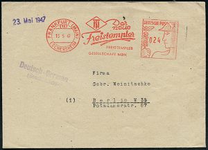 3525 | 25 € | WESTZONEN / BIZONE / TRIZONE (BIS 1949) : (16) FRANKFURT (MAIN)/ FECHENHEIM(TN/ Der/ neue/ Freistempler/ FREISTEMPLER/ GMBH 1947 (16.5.) AFS Postalia "Merkurkopf" 024 Pf. (Firmen-Monogr.-Logo TN = Telefonbau & Normalzeit) rs. Abs.-HdN, klar gest. Fern-Bf. (Dü.E-19 A ) | ![]() ![]() | |