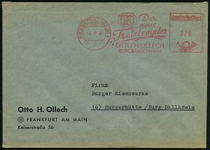 3529 | 18 € | WESTZONEN / BIZONE / TRIZONE (BIS 1949) : (16) FRANKFURT (MAIN) 1/ OHO/ Der/ neue/ Freistempler/ OTTO H.OLLECH.. 1948 (5.11.) AFS Postalia "Posthorn" (Monogr.-Logo) Firmen-Bf.: Otto H. Ollech.. (Dü.E-20 B) | ![]() | |