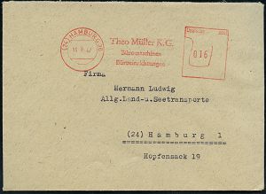 3531 | 28 € | WESTZONEN / BIZONE / TRIZONE (BIS 1949) : (24) HAMBURG 36/ Theo Müller K.G./ Büromaschinen.. 1947 (16.8.) aptierter AFS "Reichsadler" , nur Konturen + "Reichs" entfernt = Notmaßnahme! , rs. Abs.-Vordruck, seltener Orts-Bf. (Dü.E-15 F) | ![]() | |